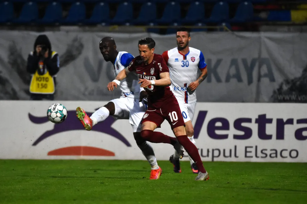 Ciprian Deac (D), de la CFR Cluj, lupta pentru balon cu Ulrich Meleke (S), de la FC Botosani, in meciul de fotbal din etapa 9 a play-off-ului Ligii 1, disputat pe stadionul Municipal din Botosani, marti, 18 mai 2021. DRAGOS PASCANEANU/ MEDIAFAX FOTO