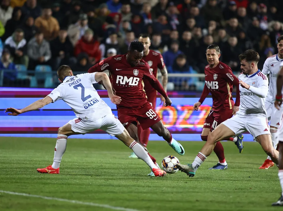 Michael Peter Godly , Ciprian Ioan Deac și Frederic Ferreira Maciel în meciul de fotbal dintre SC Oțelul Galați si FC CFR 1907 Cluj, contând pentru Superliga Superbet, desfășurat pe Stadionul Oțelul din Galați, marți 27 februarie 2024. © FOTO: Sorin PANĂ/SPORT PICTURES
