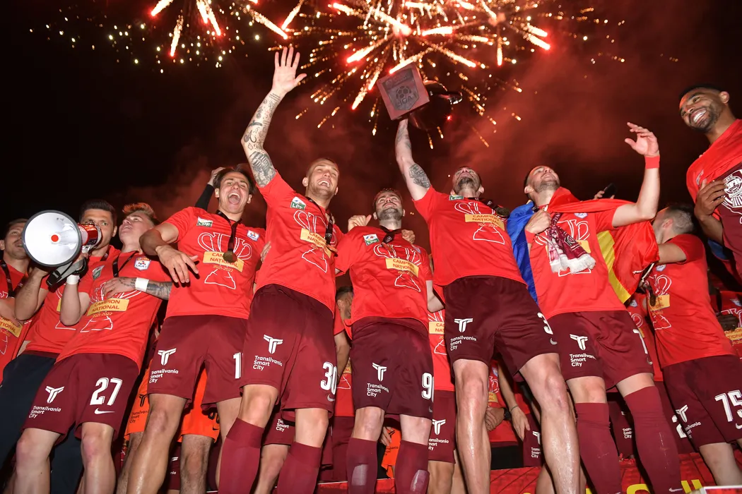 Bucurie clujeana cu Claudiu Adrian Mihai Petrila, Raoul Mal, George Daniel Birligea si Andonie Andrei Burca dupa castigarea campionatului in urma meciului de fotbal dintre CFR Cluj si Universitatea Craiova, contand pentru Play-off-ul Ligii 1 Casa Pariurilor, desfasurat pe Stadionul CFR Dr. Constantin Radulescu din Cluj Napoca, duminica 15 mai 2022. © FOTO:Razvan Pasarica/SPORT PICTURES