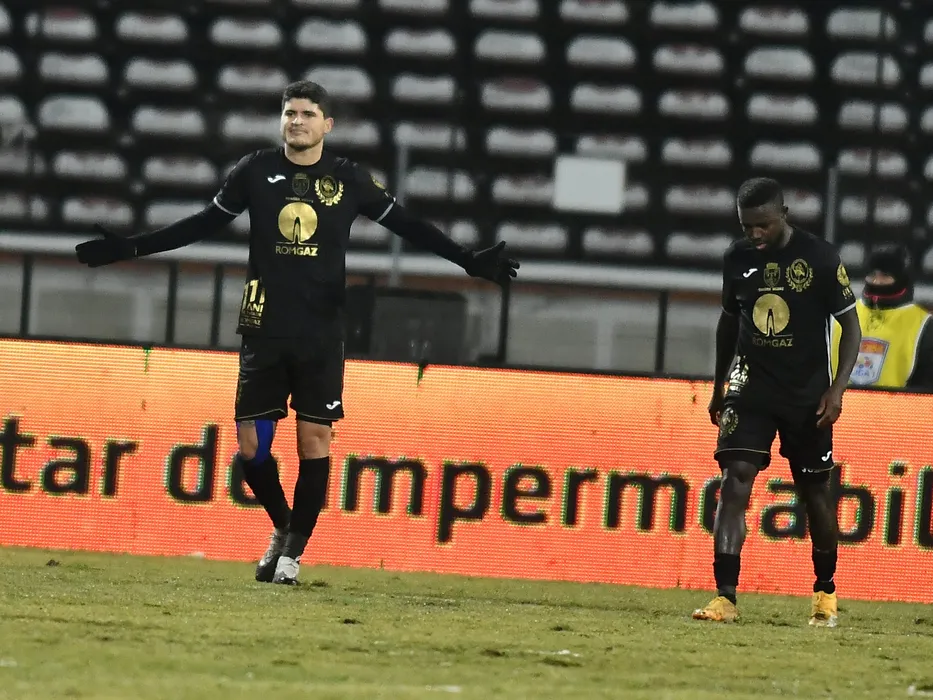Jefferson Yuri De Sousa Matias si Bryan Alceus in meciul de fotbal dintre Dinamo Bucuresti si Gaz Metan Medias, contand pentru Liga 1 Casa Pariurilor, desfasurat fara spectatori pe Stadionul Dinamo din Bucuresti, miercuri 27 ianuarie 2021. © FOTO:Razvan Pasarica/SPORT PICTURES