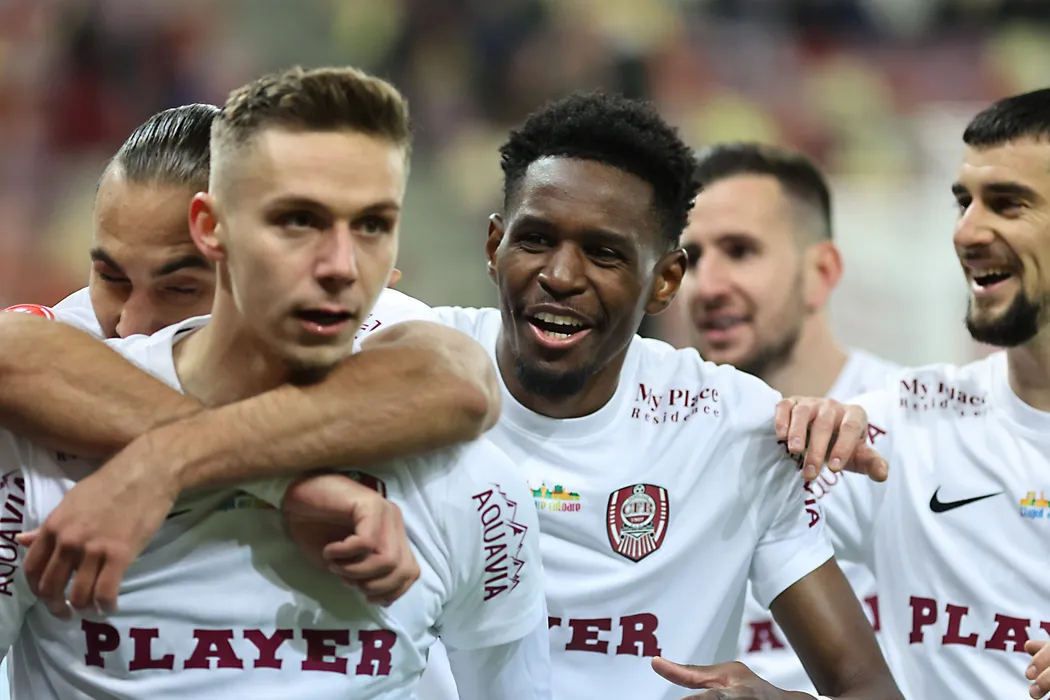 Bucurie a fotbalistilor clujeni Virgiliu Postolachi, Louis Munteanu si Beni Jean Luc Nkololo dupa un gol marcat in meciul de fotbal dintre FCSB si CFR Cluj, din cadrul Superligii Superbet, desfasurat pe Arena Nationala din Bucuresti, duminica 2 februarie 2025. © FOTO:Gheorghe Fluster/SPORT PICTURES