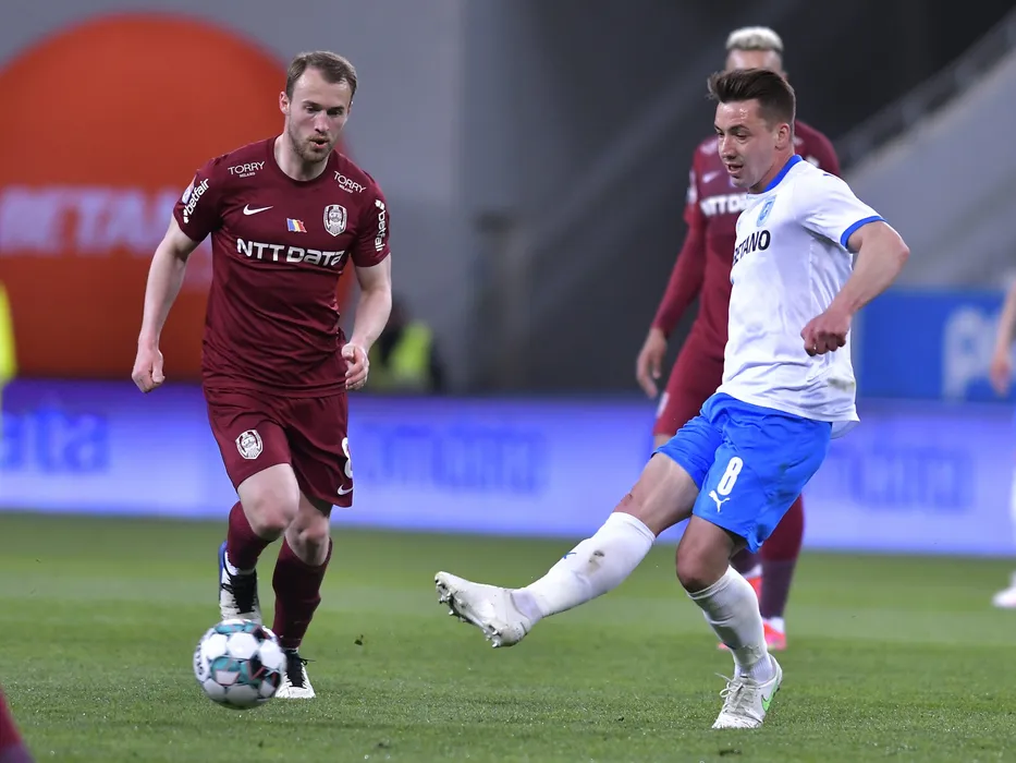 Runar Mar S Sigurjonsson si Alexandru Mateiu in meciul de fotbal dintre Universitatea Craiova si CFR Cluj, contand pentru Liga 1 Casa Pariurilor, desfasurat fara spectatori pe Stadionul Ion Oblemenco din Craiova, duminica 11 aprilie 2021. © FOTO:Razvan Pasarica/SPORT PICTURES