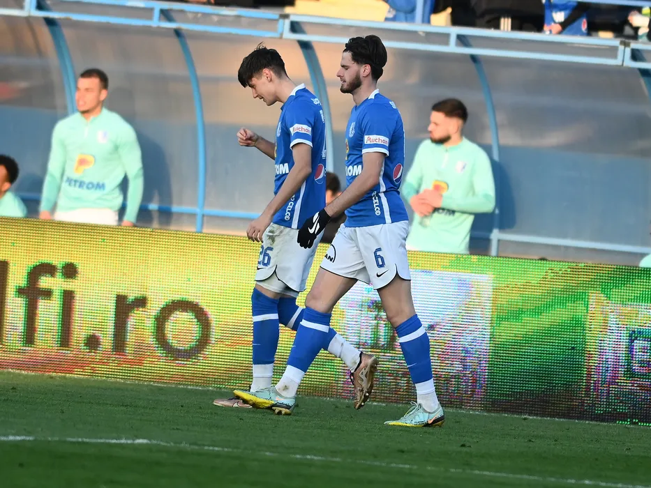 Adrian Mazilu se bucura dupa un gol marcat alaturi de Tudor Cristian Baluta in meciul de fotbal dintre Farul Constanta si Sepsi OSK Sfantu Gheorghe, contand pentru Play-off-ul Superligii Superbet, desfasurat pe Stadionul central al Academiei Gheorghe Hagi din Ovidiu, duminica 19 martie 2023. © FOTO:Razvan Pasarica/SPORT PICTURES