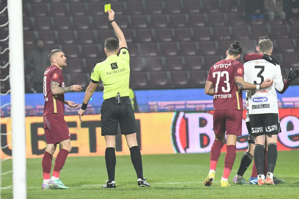 Arbitrul central Marian Barbu arată cartonașil galben lui George Daniel Bîrligea în meciul de fotbal dintre FC CFR 1907 Cluj SA si AS FC Universitatea Cluj, contând pentru Superliga Superbet, desfășurat pe Stadionul Dr.Constantin Rădulescu din Cluj-Napoca, joi 21 decembrie 2023. © FOTO: Flaviu BUBOI/SPORT PICTURES