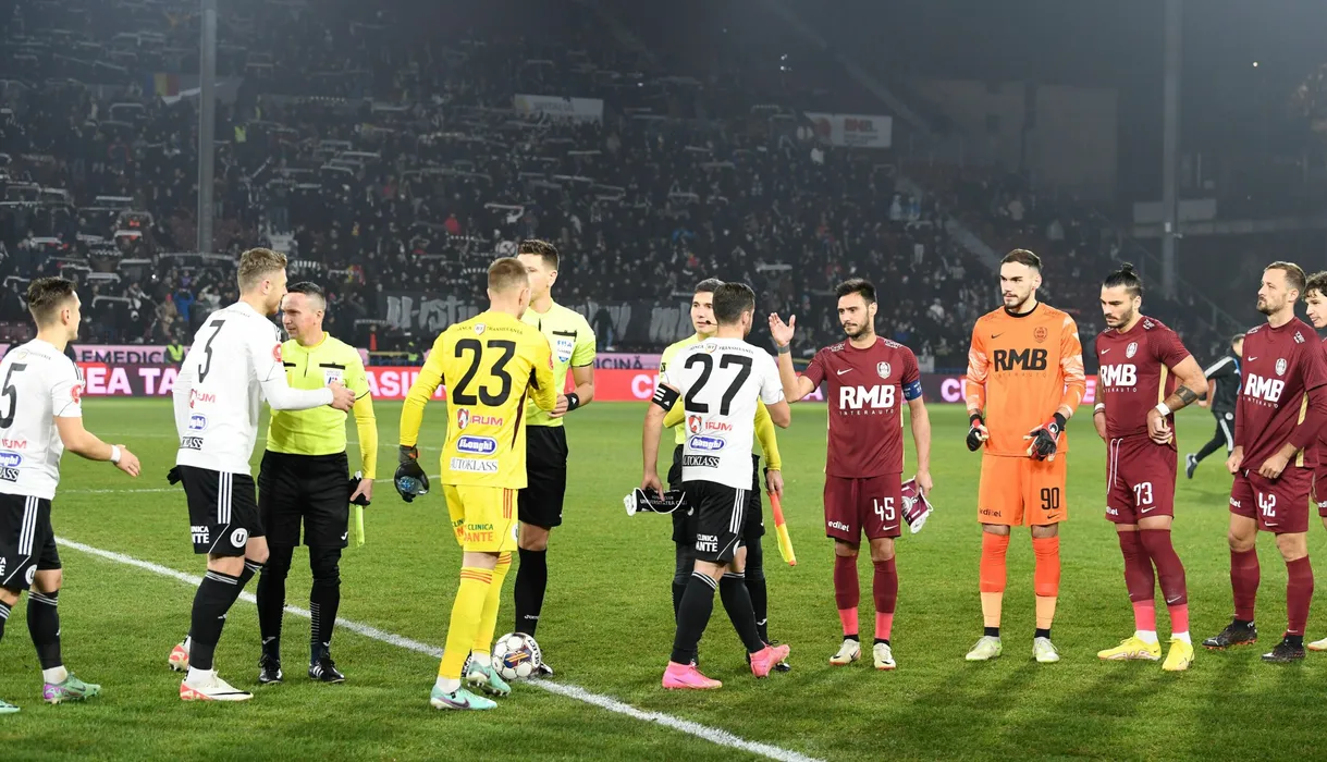 Jucătorii celor două echipe se salută la startul meciului de fotbal dintre FC CFR 1907 Cluj SA si AS FC Universitatea Cluj, contând pentru Superliga Superbet, desfășurat pe Stadionul Dr.Constantin Rădulescu din Cluj-Napoca, joi 21 decembrie 2023. © FOTO: Flaviu BUBOI/SPORT PICTURES