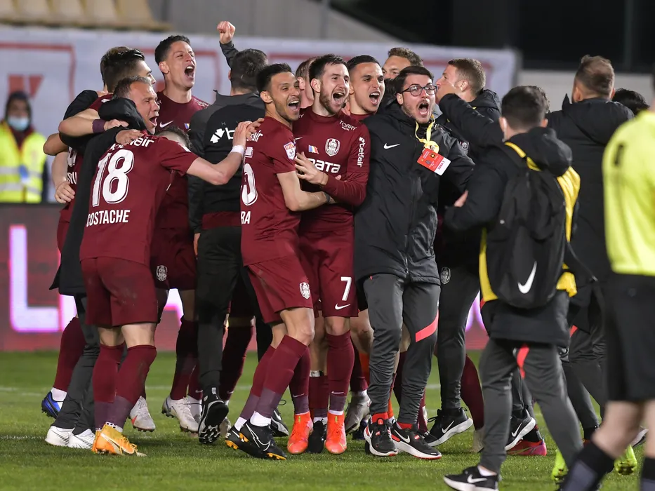 Fotbalistii clujeni Mario Junior Rondon Fernandez, Mario Camora, Denis Ciobotariu si Constantin Adrian Paun se bucura dupa castigarea Supercupei Romaniei in urma meciului impotriva FCSB, Supercupa Romaniei, desfasurat fara spectatori pe Stadionul Ilie Oana din Ploiesti, joi 15 aprilie 2021. © FOTO:Razvan Pasarica/SPORT PICTURES