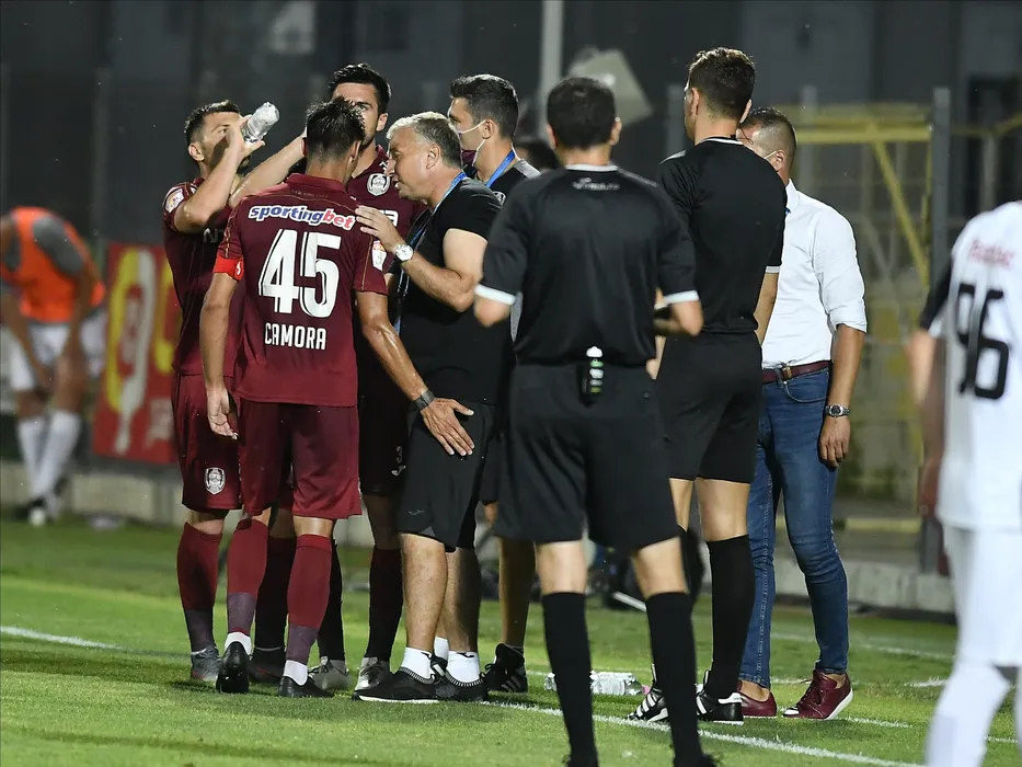 Dan Petrescu alaturi de Mario Camora la o pauza de hidratare in meciul de fotbal dintre Astra Giurgiu si CFR Cluj, contand pentru play-off-ul Ligii 1 Casa Pariurilor, disputat fara spectatori pe Stadionul Marin Anastasovici din Giurgiu, duminica 5 iulie 2020. © FOTO:Razvan Pasarica/SPORT PICTURES