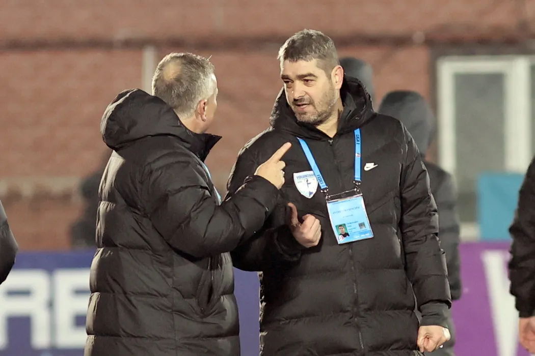Liviu Ciobotariu (D), antrenorul echipei FC Voluntari, discuta cu Dan Petrescu (S), antrenorul formatiei CFR Cluj, in timpul meciului de fotbal contra formatiei CFR Cluj din etapa 29 a a Ligii 1, disputat pe stadionul Anghel Iordanescu din Voluntari, miercuri, 2 martie 2022. GEORGE FILIP / MEDIAFAX FOTO