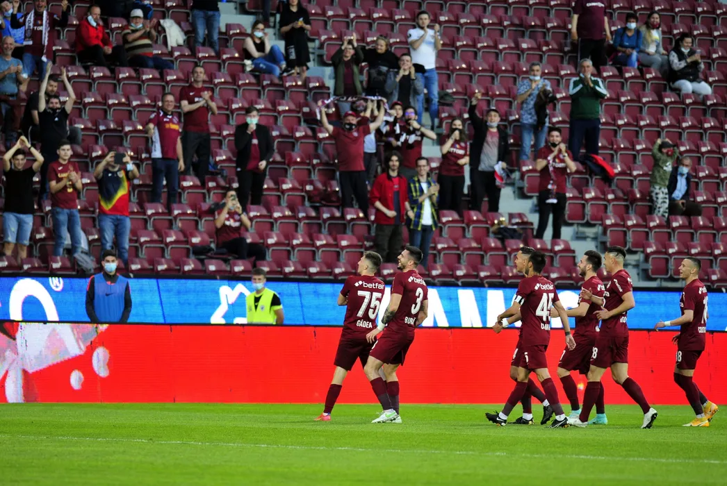 Adrian Mihai Gidea (S), de la CFR Cluj, reactioneaza dupa ce a inscris un gol in timpul meciului de fotbal contra echipei FCSB din etapa 10 a play-off-ului Ligii 1, cu suporteri in tribune, disputat pe stadionul Dr. Constantin Radulescu din Cluj-Napoca, luni, 10 mai 2021. DAN HORIA TAUTAN / MEDIAFAX FOTO