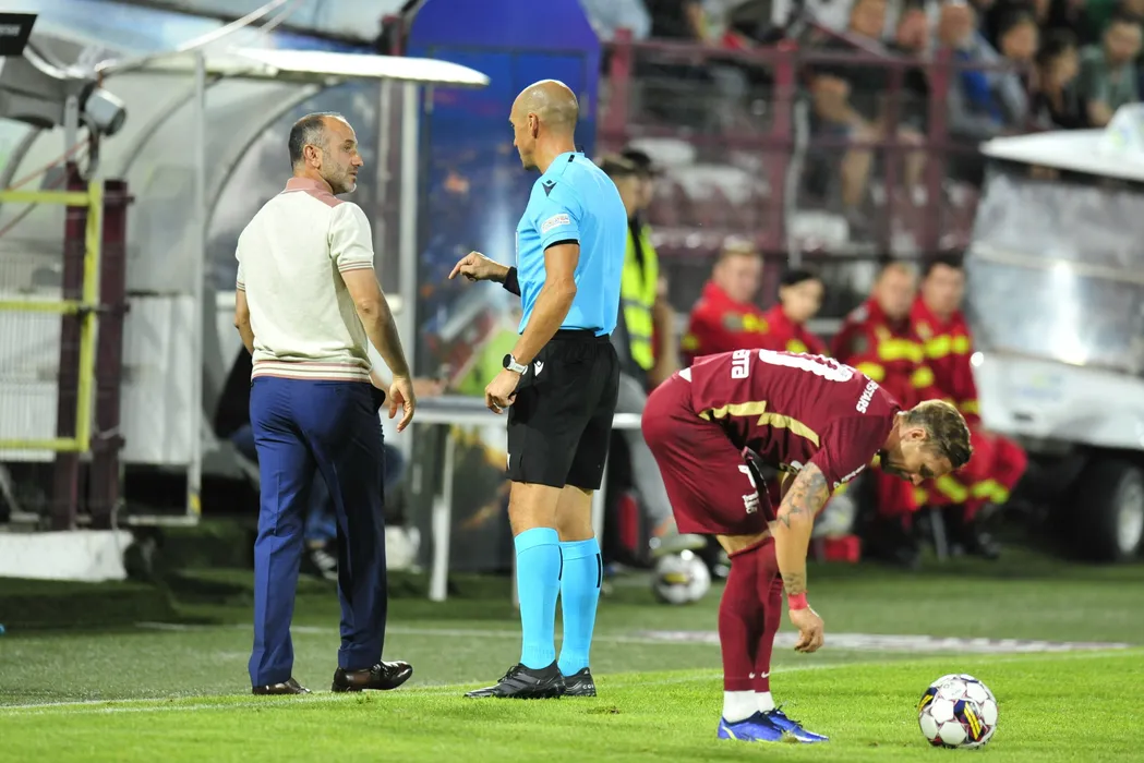 Eghishe Melykan (S), antrenorul echipei Pyunik Everan, este atentionat de arbitrul Michael Fabbri, in timpul meciului de fotbal contra formatiei CFR Cluj din returul primului tur preliminar al Ligii Campionilor, disputat pe stadionul Dr. Constantin Radulescu din Cluj-Napoca, miercuri, 13 iulie 2022. DAN HORIA TAUTAN / MEDIAFAX FOTO