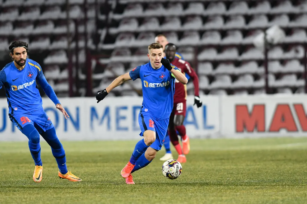 Darius Olaru, de la FCSB, suteaza in timpul meciului de fotbal contra echipei CFR Cluj din etapa a XXIV-a a Superligii, disputat pe stadionul Constantin Radulescu din Cluj-Napoca, duminica,5 februarie 2023. FLAVIU BUBOI / MEDIAFAX FOTO
