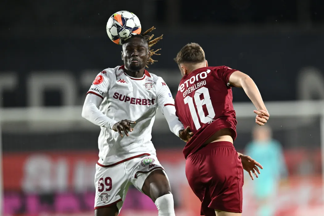 Peter Oluwaseun Ademo si Lindon Emerllahu in meciul de fotbal dintre FC CFR 1907 Cluj si FC Rapid 1923 Bucuresti, contand pentru Superliga Superbet - Play-Off, desfasurat pe Stadionul Dr.Constantin Radulescu din Cluj-Napoca, luni 14 aprilie 2025. © FOTO: Flaviu Buboi/SPORT PICTURES