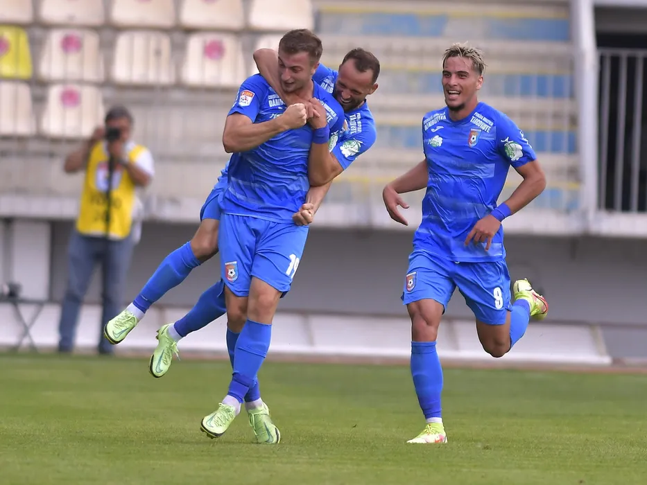 Bucurie a fotbalistilor targovisteni dupa un gol marcat cu Iliuta Daniel Popa, Cristian Daniel Negut si Marco Alexandru Dulca in meciul de fotbal dintre Chindia Targoviste si Farul Constanta, contand pentru Liga 1 Casa Pariurilor, desfasurat pe Stadionul Ilie Oana din Ploiesti, sambata 18 septembrie 2021. © FOTO:Razvan Pasarica/SPORT PICTURES