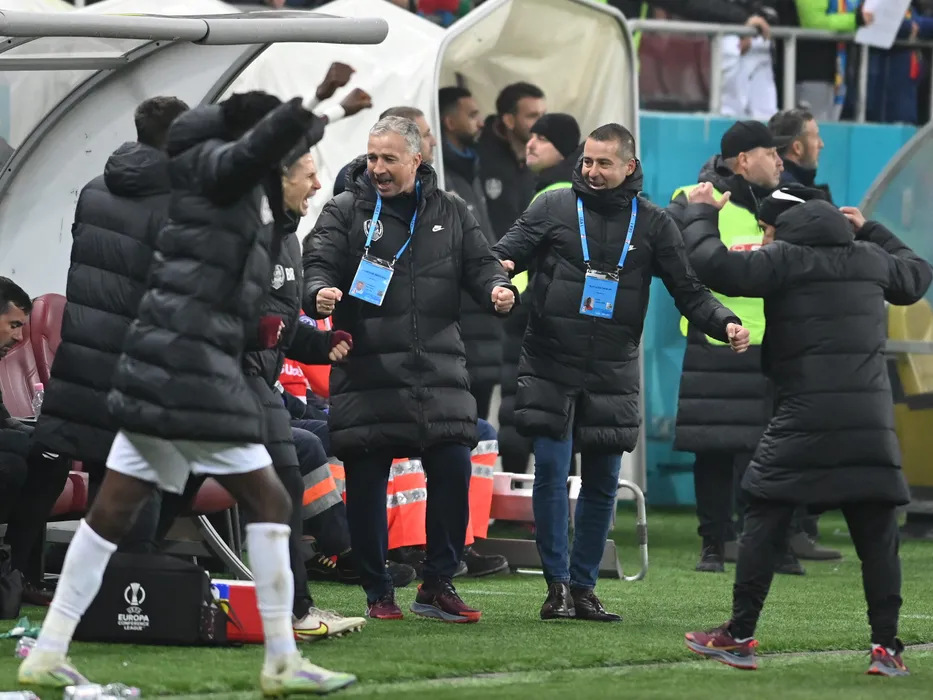 Dan Petrescu si Cristian Panin se bucura dupa meciul de fotbal dintre FCSB si CFR Cluj, contand pentru Superliga Superbet, desfasurat pe Arena Nationala din Bucuresti, joi 15 decembrie 2022. © FOTO:Razvan Pasarica/SPORT PICTURES