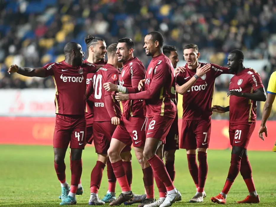 Bucurie a fotbalistilor clujeni dupa un gol marcat cu Christopher Braun, Andonie Andrei Burca,Rangelo Maria Janga, Ermal Krasniqi si Bismark Adjei Boateng in meciul de fotbal dintre Petrolul Ploiesti si CFR Cluj, contand pentru Superliga Superbet, desfasurat pe Stadionul Ilie Oana din Ploiesti, luni 27 februarie 2023. © FOTO:Razvan Pasarica/SPORT PICTURES