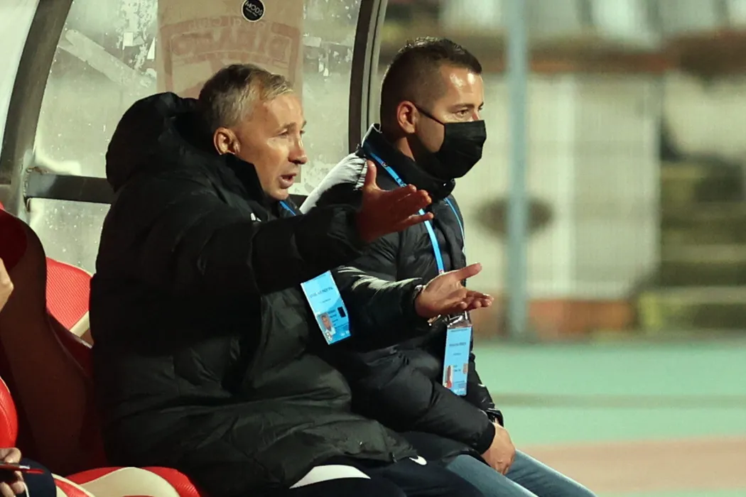 Dan Petrescu (S), antrenorul echipei CFR Cluj, urmareste meciul de fotbal contra formatiei FC Dinamo din etapa a XV-a a Ligii 1, disputat pe stadionul Dinamo din Bucuresti, sambata, 7 noiembrie 2021. GEORGE FILIP / MEDIAFAX FOTO