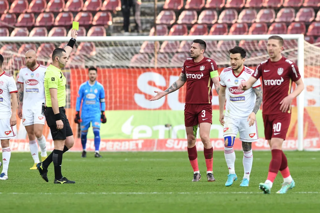Arbitrul central Iulian Calin acorda un cartonas galben lui Andonie Andrei Burca in meciul de fotbal dintre CFR Cluj si Sepsi OSK Sfantu Gheorghe, contand pentru Play-off-ul Superligii Superbet, desfasurat pe Stadionul Dr. Constantin Radulescu din Cluj Napoca, sambata 15 aprilie 2023. © FOTO:Flaviu Buboi/SPORT PICTURES