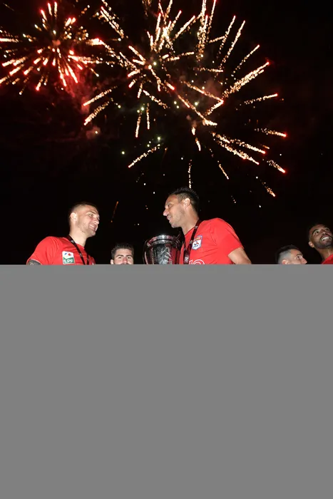 Bucurie clujeana cu George Daniel Birligea, Florin Bogdan Stefan si Mario Camora dupa castigarea campionatului in urma meciului de fotbal dintre CFR Cluj si Universitatea Craiova, contand pentru Play-off-ul Ligii 1 Casa Pariurilor, desfasurat pe Stadionul CFR Dr. Constantin Radulescu din Cluj Napoca, duminica 15 mai 2022. © FOTO:Razvan Pasarica/SPORT PICTURES