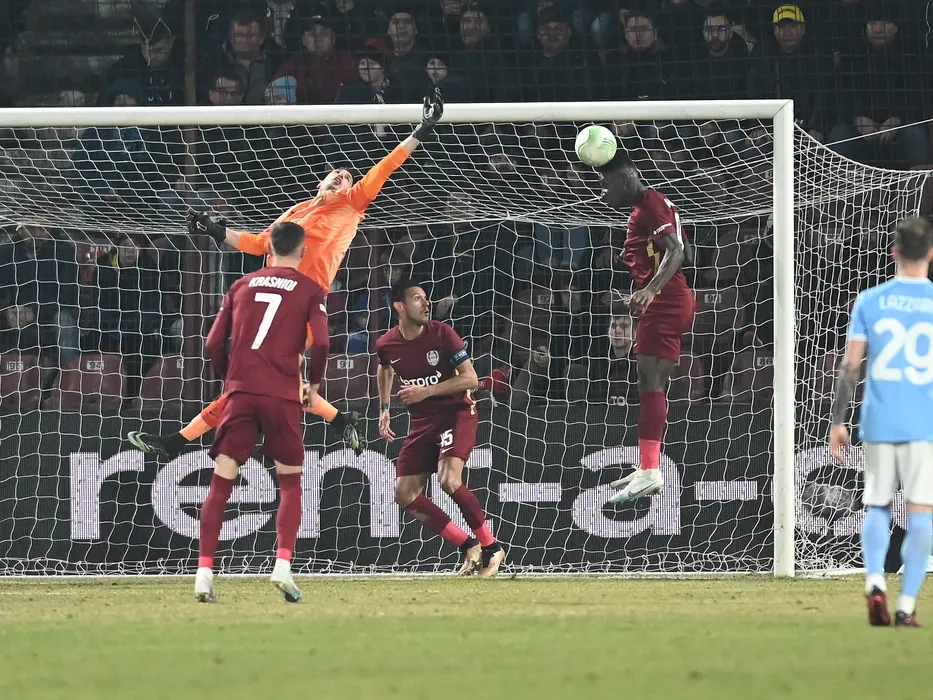 Simone Scuffet, Mario Camora si Cephas Malele in meciul de fotbal dintre CFR Cluj si SS Lazio, din cadrul UEFA Europa Conference League, desfasurat pe Stadionul Dr. Constantin Radulescu din Cluj Napoca, joi 23 februarie 2023. © FOTO:Razvan Pasarica/SPORT PICTURES