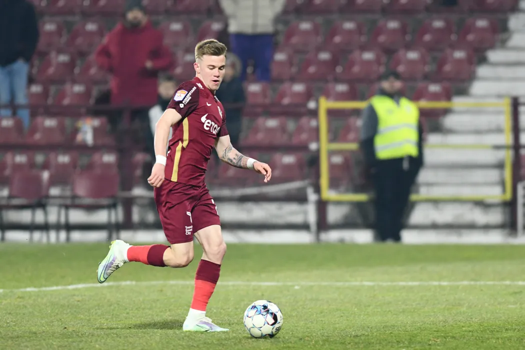 Claudiu Petrila, de la CFR Cluj, suteaza in timpul meciului de fotbal contra echipei FC Voluntari din prima etapa a play-off-ului Ligii 1, disputat pe stadionul Dr. Constantin Radulescu din Cluj-Napoca, sambata, 12 martie 2022. FLAVIU BUBOI / MEDIAFAX FOTO