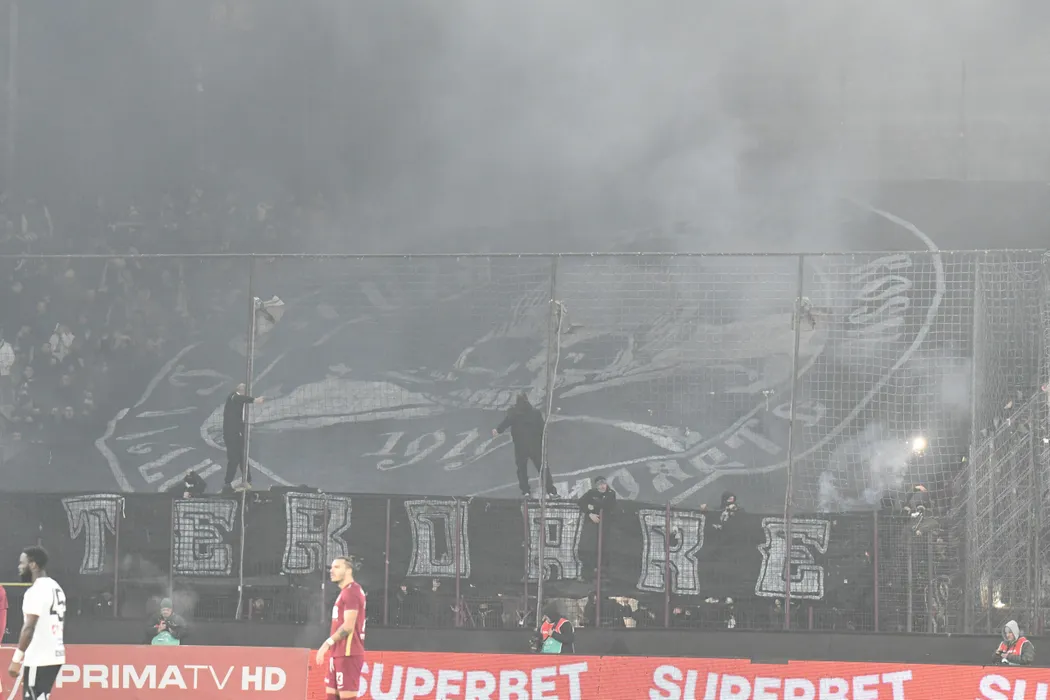 Baner ceferist în meciul de fotbal dintre FC CFR 1907 Cluj SA si AS FC Universitatea Cluj, contând pentru Superliga Superbet, desfășurat pe Stadionul Dr.Constantin Rădulescu din Cluj-Napoca, joi 21 decembrie 2023. © FOTO: Flaviu BUBOI/SPORT PICTURES