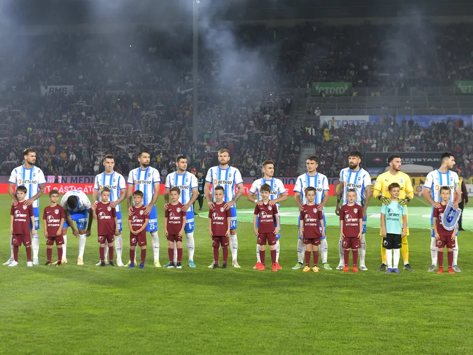 Fotbalistii craioveni la startul meciului de fotbal dintre CFR Cluj si Universitatea Craiova, contand pentru Play-off-ul Ligii 1 Casa Pariurilor, desfasurat pe Stadionul CFR Dr. Constantin Radulescu din Cluj Napoca, duminica 15 mai 2022. © FOTO:Razvan Pasarica/SPORT PICTURES