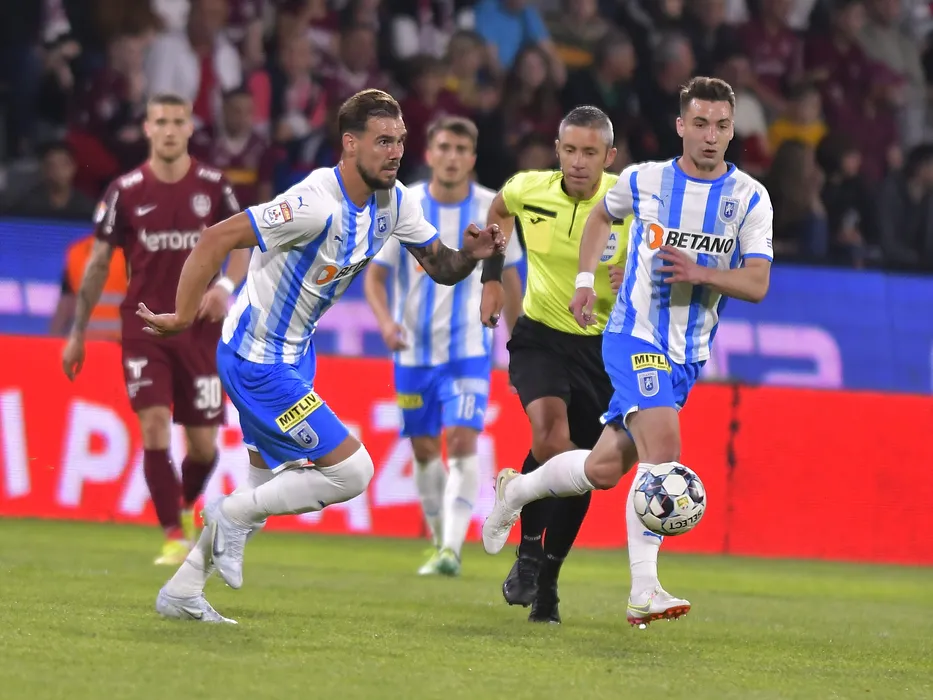 Elvir Koljic si Alexandru Mateiu alaturi de arbitrul central Radu Petrescu in meciul de fotbal dintre CFR Cluj si Universitatea Craiova, contand pentru Play-off-ul Ligii 1 Casa Pariurilor, desfasurat pe Stadionul CFR Dr. Constantin Radulescu din Cluj Napoca, duminica 15 mai 2022. © FOTO:Razvan Pasarica/SPORT PICTURES