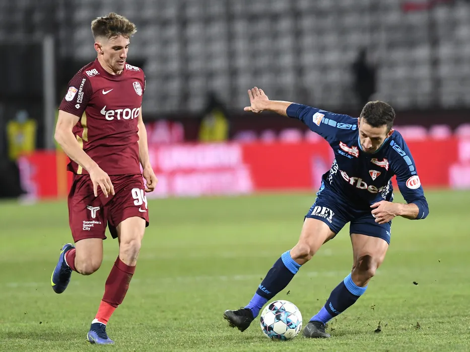 Roger Junio Rodrigues Figueira si Catalin Mihai Itu in meciul de fotbal dintre CFR Cluj si UTA Arad, contand pentru Liga 1 Casa Pariurilor, desfasurat pe Stadionul Dr. Constantin Radulescu din Cluj Napoca, marti 08 februarie 2022. © FOTO:Flaviu Buboi/SPORT PICTURES