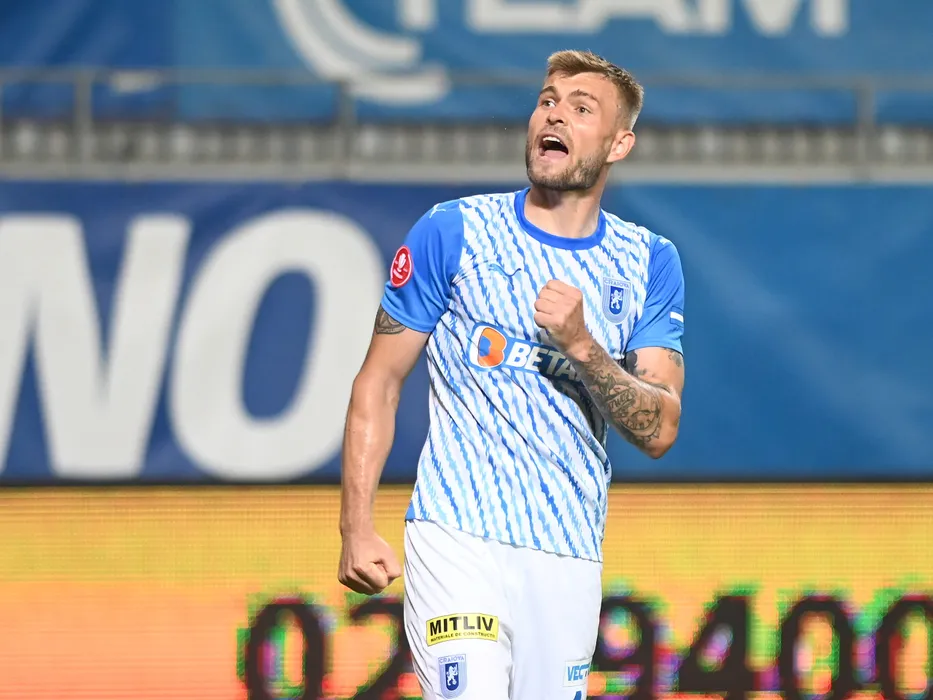 Alexandru Cretu se bucura dupa un gol marcat in meciul de fotbal dintre Universitatea Craiova si UTA Arad, contand pentru Superliga Superbet, desfasurat pe Stadionul Ion Oblemenco din Craiova, vineri 18 august 2023. © FOTO:Razvan Pasarica/SPORT PICTURES