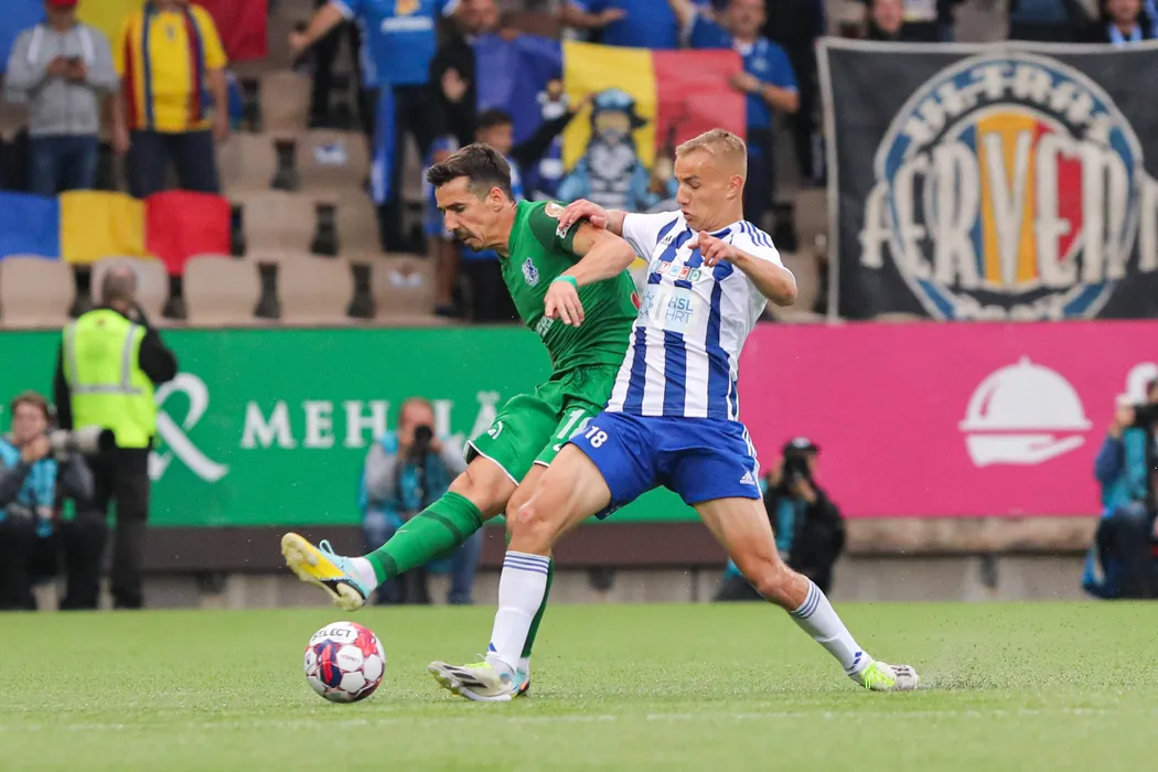Andrei Viorel Artean si Topi Keskinen in meciul de fotbal dintre HJK Helsinki si Farul Constanta, contand pentru UEFA Europa Conference League, desfasurat pe Helsinki Football Stadium din Helsinki, joi 31 august 2023. © FOTO:Antonio Vasile/SPORT PICTURES