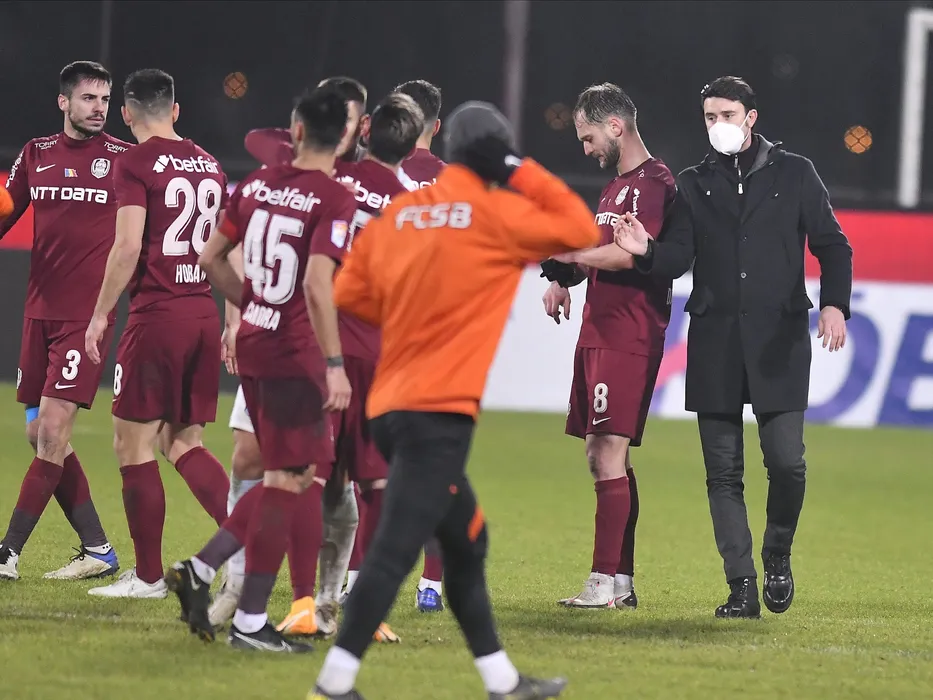 Marian Copilu ii felicita pe jucatorii clujeni Andrei Andonie Burca si Damjan Djokovic dupa meciul de fotbal dintre CFR Cluj si FCSB, contand pentru Liga 1 Casa Pariurilor, desfasurat fara spectatori pe Stadionul Dr. Constantin Radulescu din Cluj Napoca, duminica 13 decembrie 2020. © FOTO:Razvan Pasarica/SPORT PICTURES