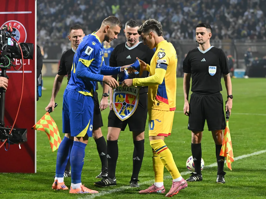 Brigada de arbitrii formata din Stuart Burt, Michael Oliver si James Mainwaring alaturi de capitanii Edin Džeko si Ianis Hagi in meciul de fotbal dintre Bosnia Hertegovina si Romania, din cadrul Preliminariilor Campionatului Mondial 2026, desfasurat pe Stadionul Bilino Polje din Zilina, sambata 15 noiembrie 2025. © FOTO:Razvan Pasarica/SPORT PICTURES