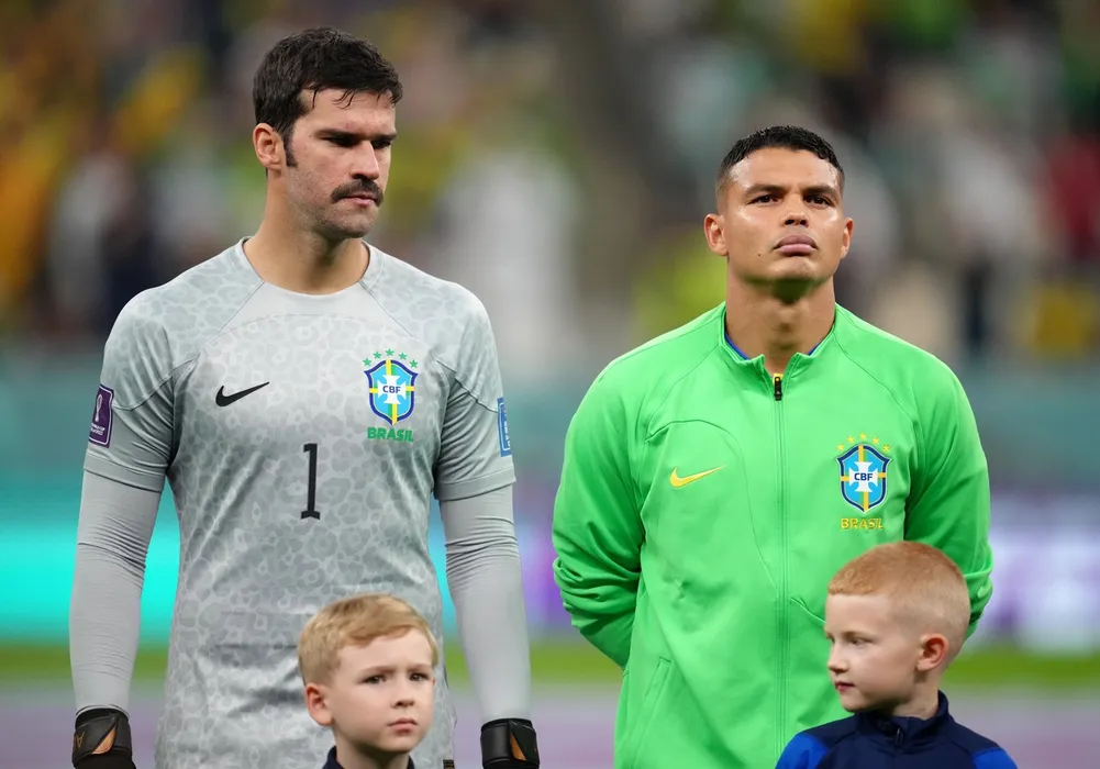 Brazil goalkeeper Alisson (left) and Thiago Silva line up before the FIFA World Cup Group G match at the Lusail Stadium in Lusail, Qatar. Picture date: Thursday November 24, 2022.,Image: 739954449, License: Rights-managed, Restrictions: Use subject to restrictions. Editorial use only, no commercial use without prior consent from rights holder., Model Release: no