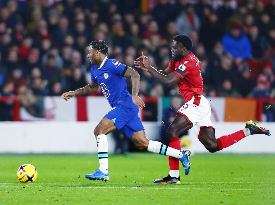 Raheem Sterling of Chelsea and Orel Mangala of Nottingham Forest