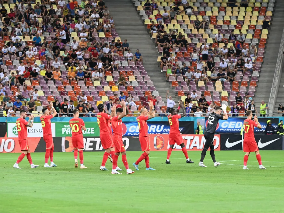 Fotbalistii stelisti saluta galeria inaintea meciului de fotbal dintre FCSB si Politehnica Iasi, din cadrul Superligii Superbet, desfasurat pe Arena Nationala din Bucuresti, duminica 20 august 2023. © FOTO:Razvan Pasarica/SPORT PICTURES