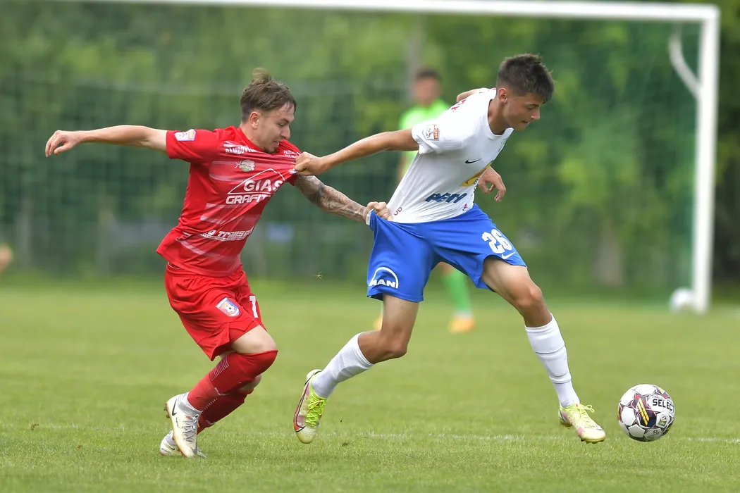 Andrei Dragos Serban si Adrian Mazilu in meciul amical de fotbal dintre Farul Constanta si Chindia Targoviste, desfasurat la Baza Campo Verde din Ghimbav, sambata 2 iulie 2022. © FOTO:Razvan Pasarica/SPORT PICTURES