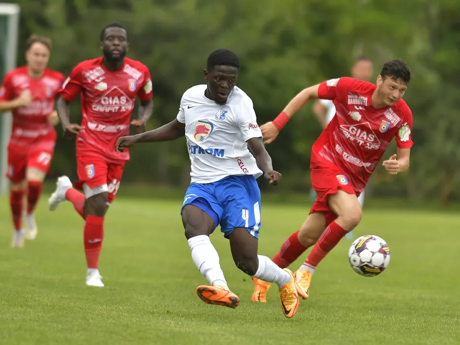 Kevin Doukoure si Denis Dumitrascu in meciul amical de fotbal dintre Farul Constanta si Chindia Targoviste, desfasurat la Baza Campo Verde din Ghimbav, sambata 2 iulie 2022. © FOTO:Razvan Pasarica/SPORT PICTURES