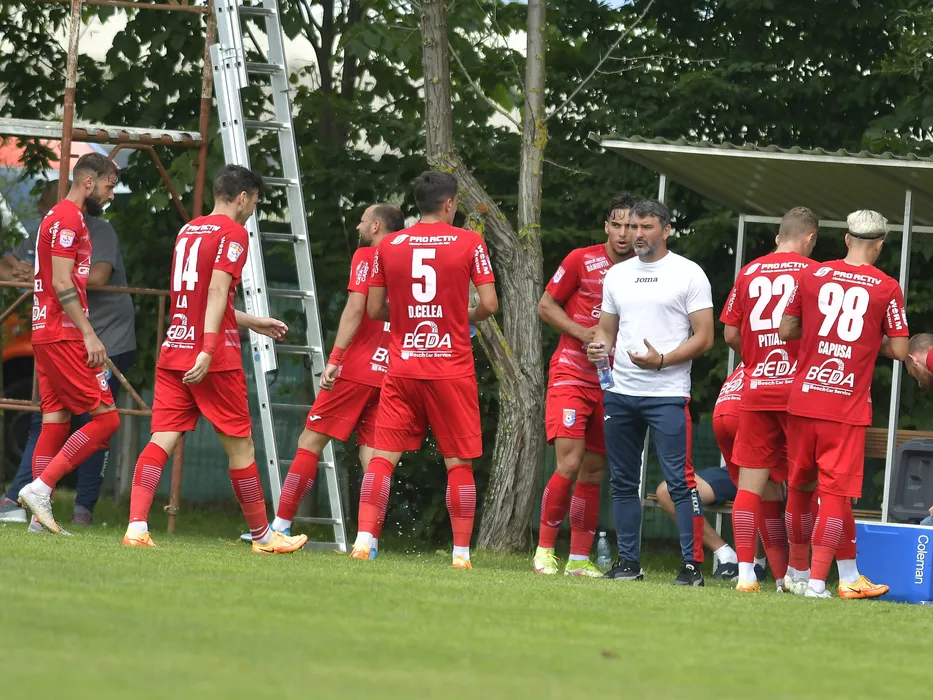 Adrian Mihalcea alaturi de fotbalistii targovisteni la o pauza de hidratare in meciul amical de fotbal dintre Farul Constanta si Chindia Targoviste, desfasurat la Baza Campo Verde din Ghimbav, sambata 2 iulie 2022. © FOTO:Razvan Pasarica/SPORT PICTURES