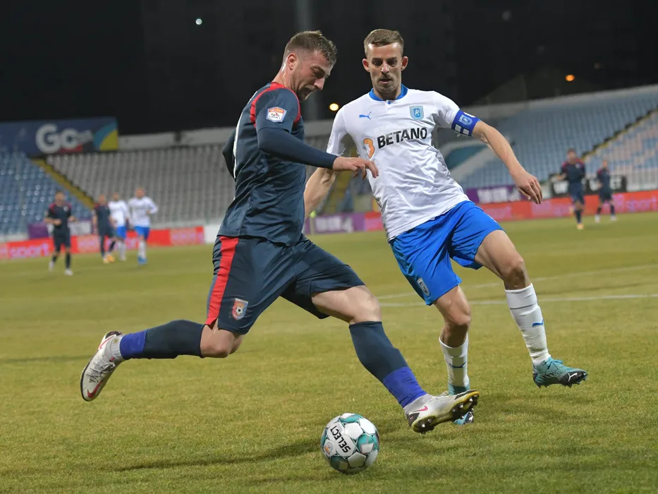 Iliuta Daniel Popa si Nicusor Silviu Bancu in meciul de fotbal dintre Chindia Targoviste si Universitatea Craiova, contand pentru Liga 1 Casa Pariurilor, desfasurat pe Stadionul Gloria din Buzau, sambata 27 februarie 2021. © FOTO:Razvan Pasarica/SPORT PICTURES