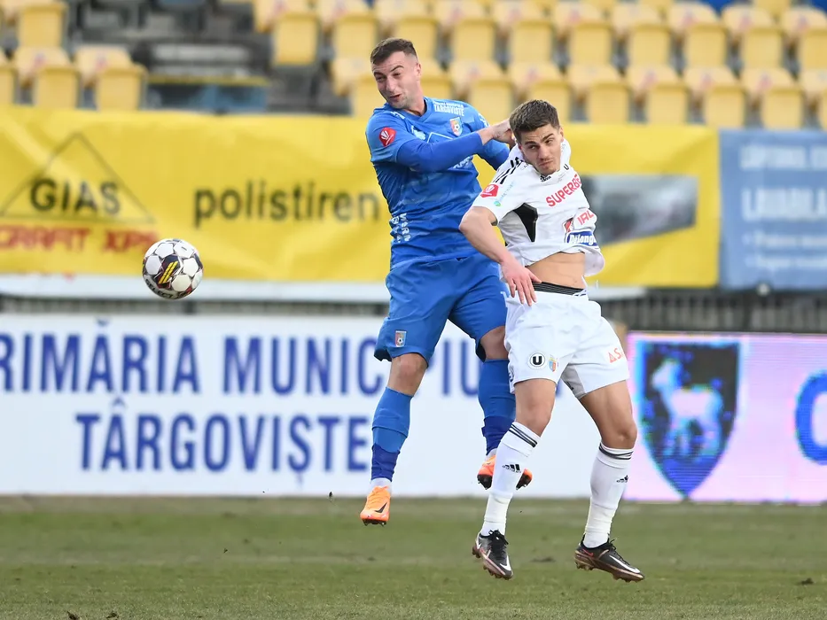 Iliuta Daniel Popa si Gabriel Bogdan Simion in meciul de fotbal dintre Chindia Targoviste si Universitatea Cluj, contand pentru Superliga Superbet, desfasurat pe Stadionul Ilie Oana din Ploiesti, vineri 17 februarie 2023. © FOTO:Razvan Pasarica/SPORT PICTURES