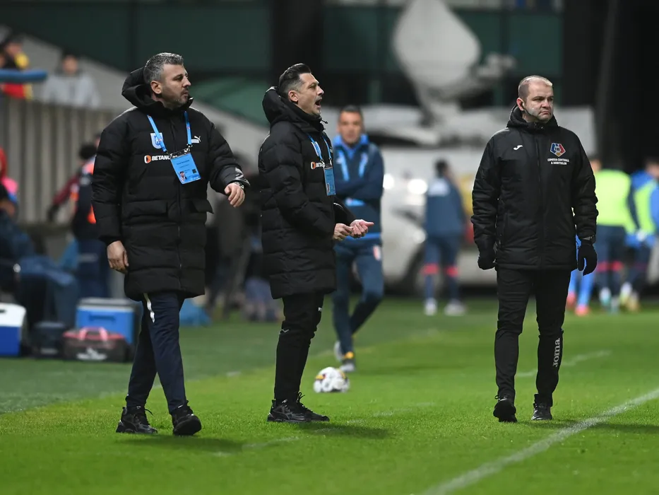 Mirel Radoi reactioneaza alaturi de Emil Pieleanu si arbitrul de rezerva Catalin Popa in meciul de fotbal dintre Chindia Targoviste si Universitatea Craiova, contand pentru Superliga Superbet, desfasurat pe Stadionul Ilie Oana din Ploiesti, marti 29 noiembrie 2022. © FOTO:Razvan Pasarica/SPORT PICTURES