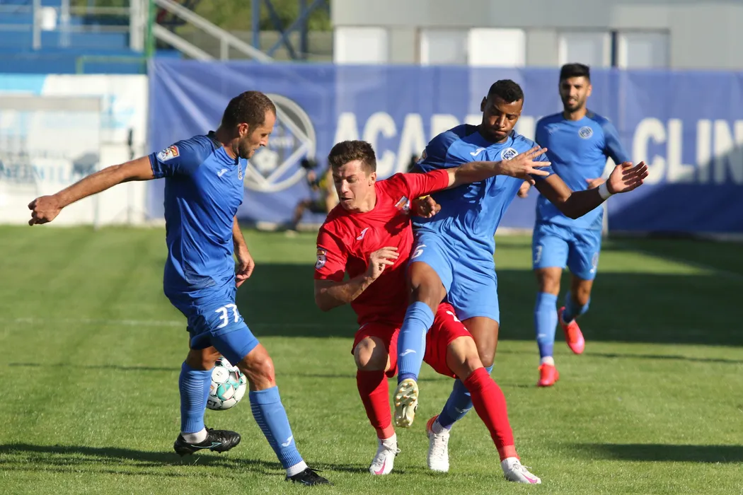 Eugen Cebotariu (S) si Georgi Pashov (D), de la Academica Clinceni, lupta pentru balon cu Vadim Rata (C), de la Chindia Targoviste, in timpul meciului de fotbal din etapa a III-a a Ligii 1, disputat pe stadionul Clinceni din Clinceni, sambata, 12 septembrie 2020. GEORGE FILIP / MEDIAFAX FOTO