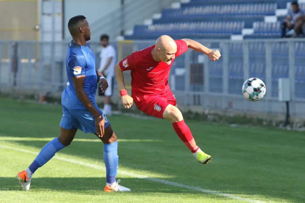 Georgi Pashov (S), de la Academica Clinceni, lupta pentru balon cu Denis Dumitrascu (D), de la Chindia Targoviste, in timpul meciului de fotbal din etapa a III-a a Ligii 1, disputat pe stadionul Clinceni din Clinceni, sambata, 12 septembrie 2020. GEORGE FILIP / MEDIAFAX FOTO