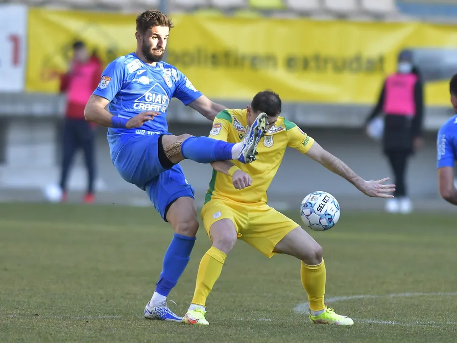 Ovidiu Andrei Pitian si Miluta Stefan Blanaru in meciul de fotbal dintre Chindia Targoviste si CS Mioveni, contand pentru Liga 1 Casa Pariurilor, desfasurat pe Stadionul Ilie Oana din Ploiesti, duminica 30 ianuarie 2022. © FOTO:Razvan Pasarica/SPORT PICTURES