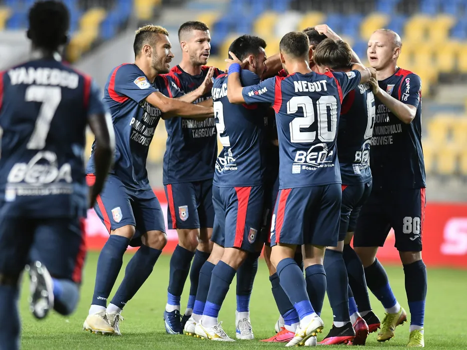 Bucurie targovisteana cu Alexandru Constantin Benga, Cornel Dinu, Marius Madalin Martac si Denis Constantin Dumitrascu in meciul de fotbal dintre Chindia Targoviste si CS Mioveni, contand pentru mansa tur a barajului pentru promovare in Liga 1 Casa Pariurilor, desfasurat fara spectatori pe Stadionul Ilie Oana din Ploiesti, duminica 9 august 2020. © FOTO:Razvan Pasarica/SPORT PICTURES