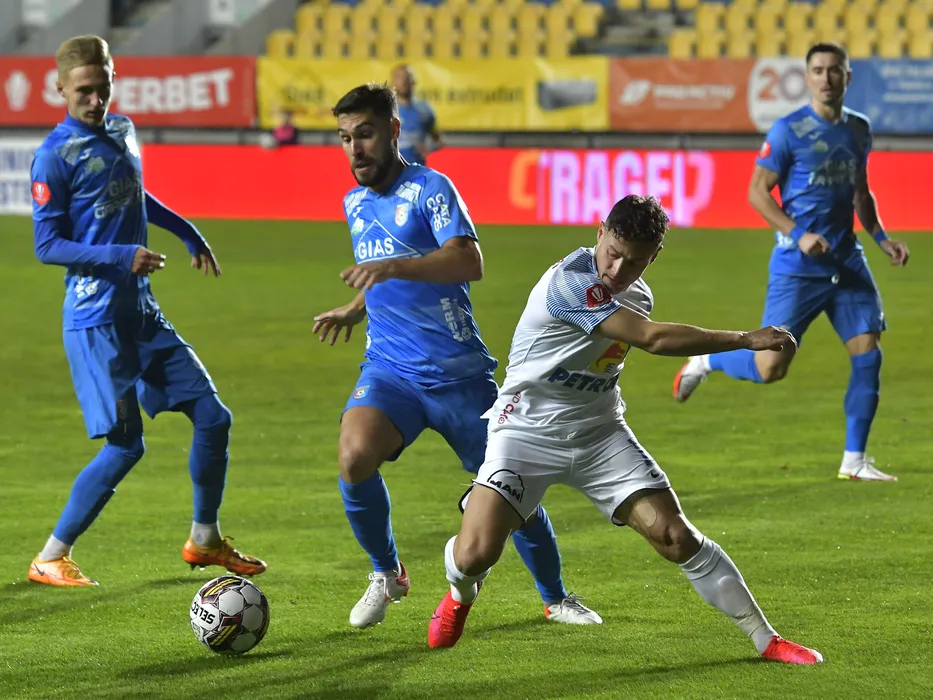 Juan Pablo Passaglia si Gabriel Andrei Torje in meciul de fotbal dintre Chindia Targoviste si Farul Constanta, contand pentru Superliga Superbet, desfasurat pe Stadionul Ilie Oana din Ploiesti, sambata 12 noiembrie 2022. © FOTO:Razvan Pasarica/SPORT PICTURES