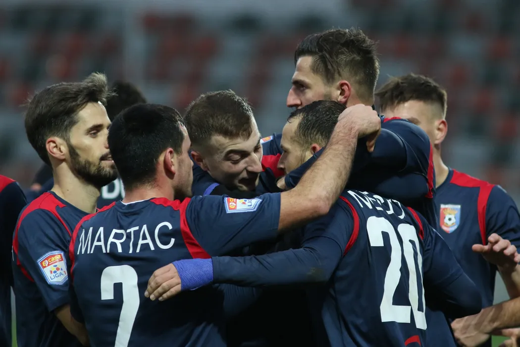 Jucatorii echipei Chindia Targoviste reactioneaza dupa inscrierea unui gol in meciul de fotbal dintre Chindia Targoviste si FC Arges din etapa a XV-a a Ligii 1, disputat pe stadionul Marin Anastasovici din Giurgiu, sambata, 19 decembrie 2020. © FOTO:Gheorghe Fluster/Sport Pictures