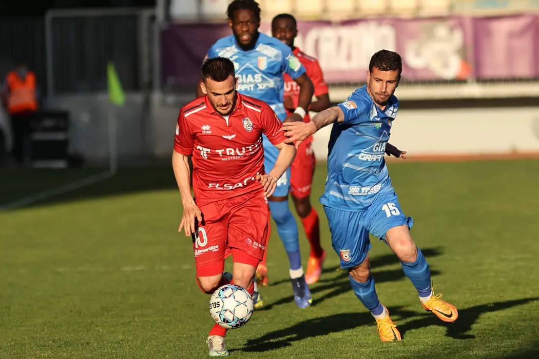 Andrei Tircoveanu si Cornel Dinu isi disputa posesia balonului in timpul partidei dintre Chindia Targoviste si FC Botosani, partida disputata in etapa a cincea din play-out-ul Ligii 1 de fotbal, vineri, 15 aprilie 2022, la Ploiesti. GEORGE FLUSTER / MEDIAFAX FOTO