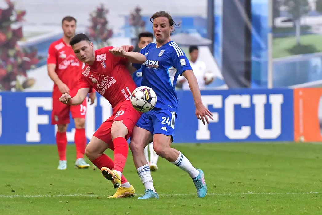 Denis Dumitrascu (S), de la Chindia Targoviste, lupta pentru balon cu William Baeten (D), de la U Craiova 1948, in meciul de fotbal din etapa a XIII-a a Superligii, disputat pe Complexul Sportiv Craiova, luni, 10 octombrie 2022. REMUS BADEA / MEDIAFAX FOTO
