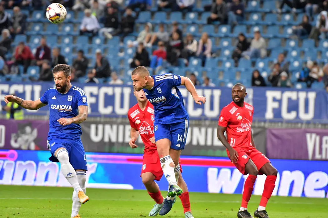 Kyriakos Papadopoulos, de la U Craiova 1948, lupta pentru balon in timpul meciului de fotbal contra echipei Chindia Targoviste din etapa a XIII-a a Superligii, disputat pe Complexul Sportiv Craiova, luni, 10 octombrie 2022. REMUS BADEA / MEDIAFAX FOTO